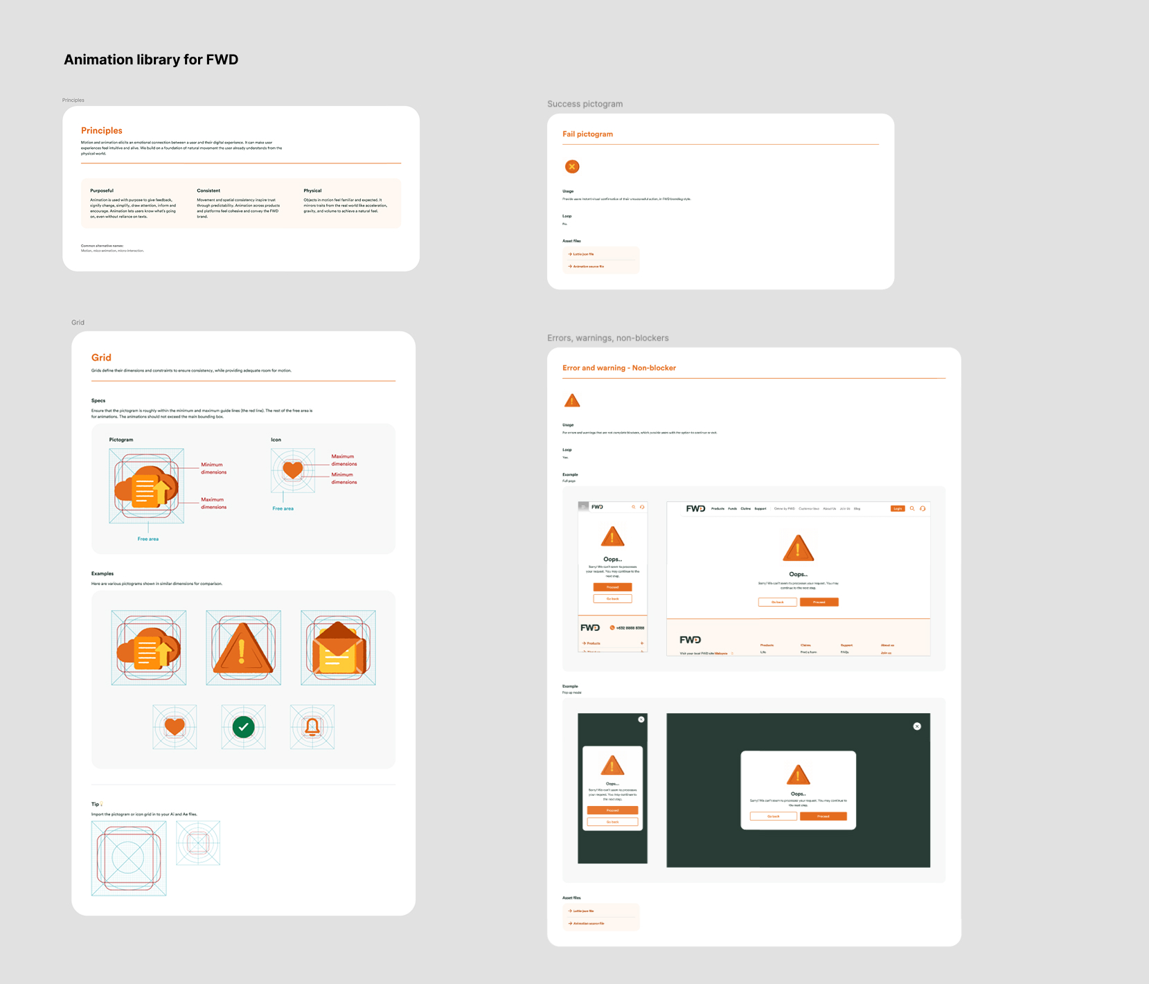 These are some animations that I've made for a few past projects such as FWD projects, AIA One, The Executive Centre and much more. I've also created a animation library for my previous design team. I used Illustrator to create the shapes and objects and animated them with After Effects. Then I exported them using Lottie by Airbnb as a json file for the developers to seamlessly integrate them. By doing this, developers are able to manipulate the animation to respond to any interactions. Because the animation is a json file, not only is it lightweight, it's also scalable without pixelation unlike gifs or videos.