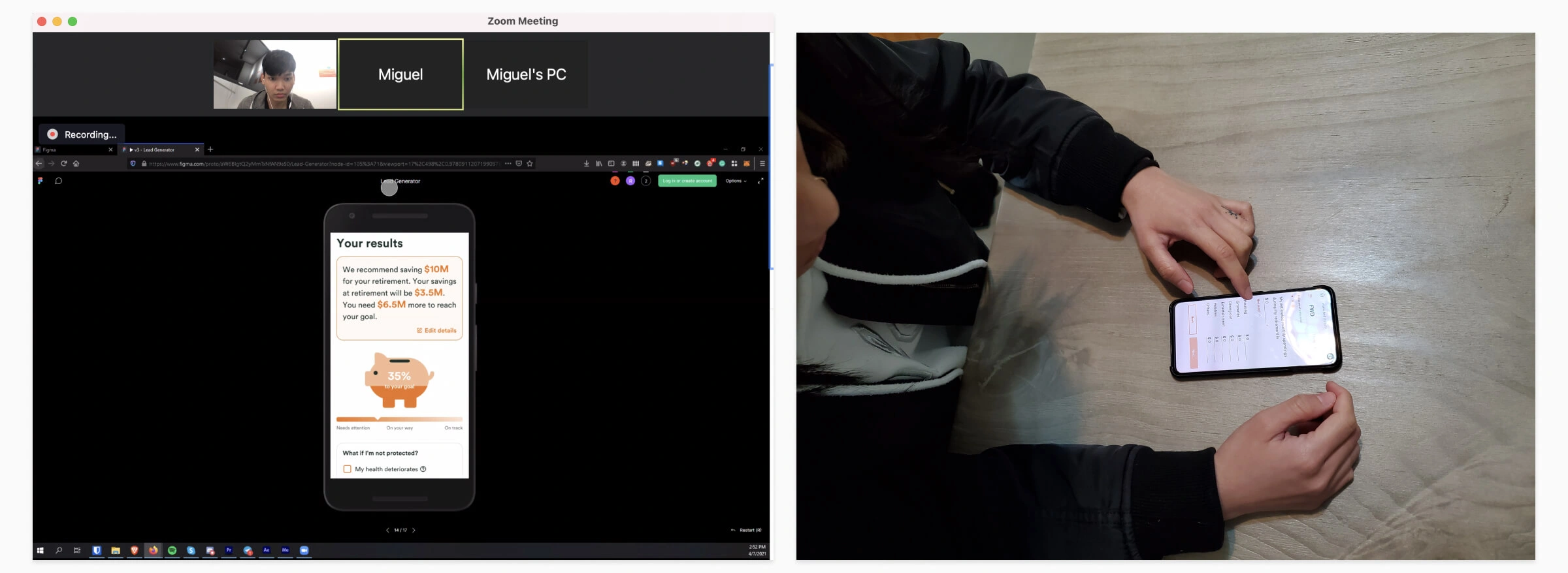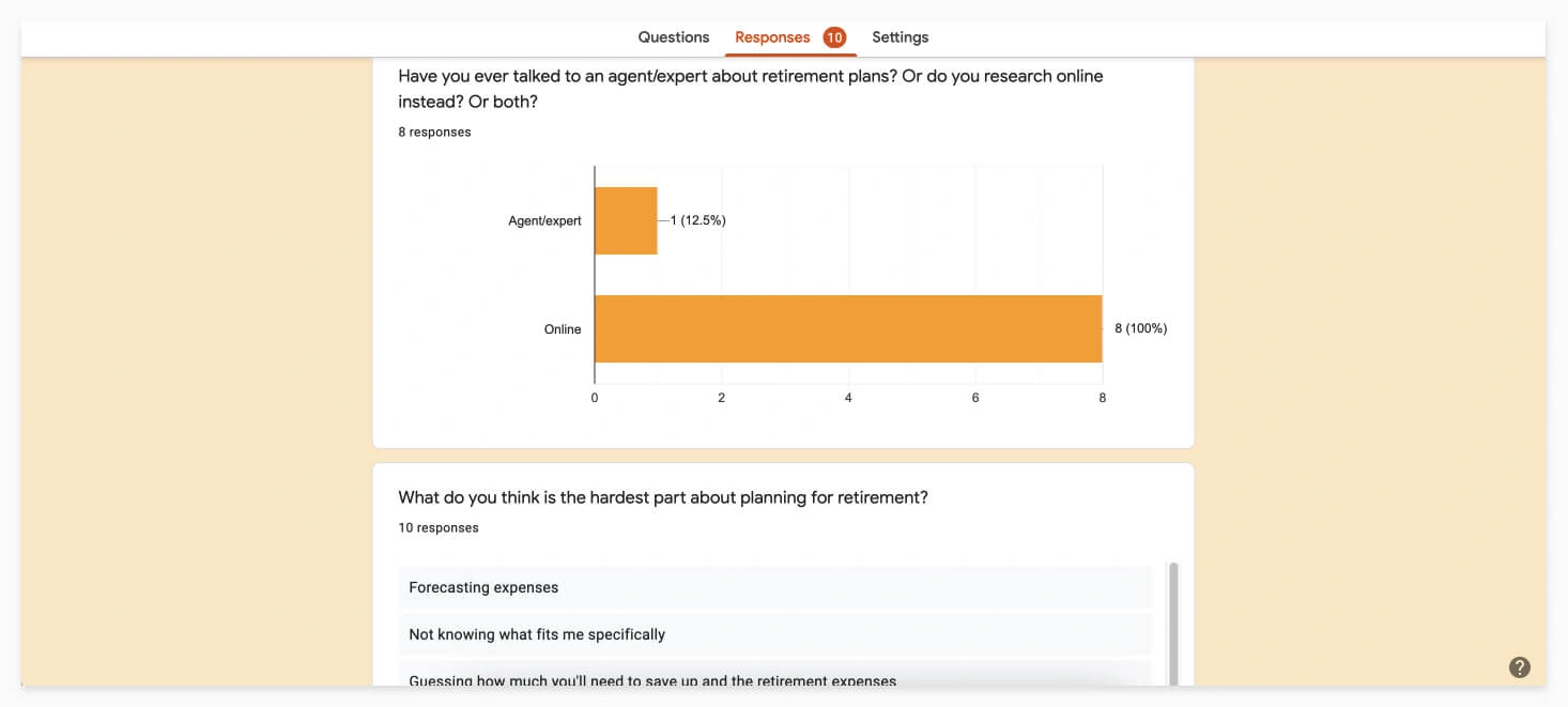 We sketched out some ideas and mocked up a prototype on Figma to test with users. The flow is as follows: The user begins at the retirement calculator landing page, then fills in their age and basic financial info (investments is an optional step), then we show them their financial and protection gaps, as well as recommended plans. We're also able to capture the leads on this page.