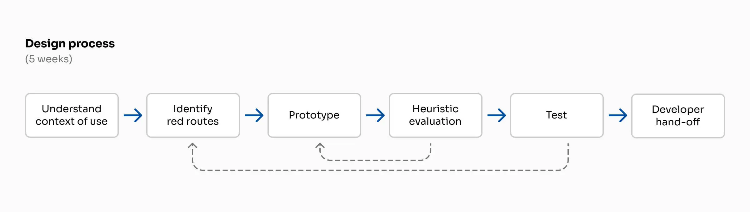 The project took 5 weeks to complete. The design process for this project is an iterative process that takes bits and pieces from the Design Thinking and Design Sprint processes; Identifying red routes, wireframing, low and high fidelity prototyping, heuristic evaluation, 3 rounds of user testing and design iterations, and developer handoff.