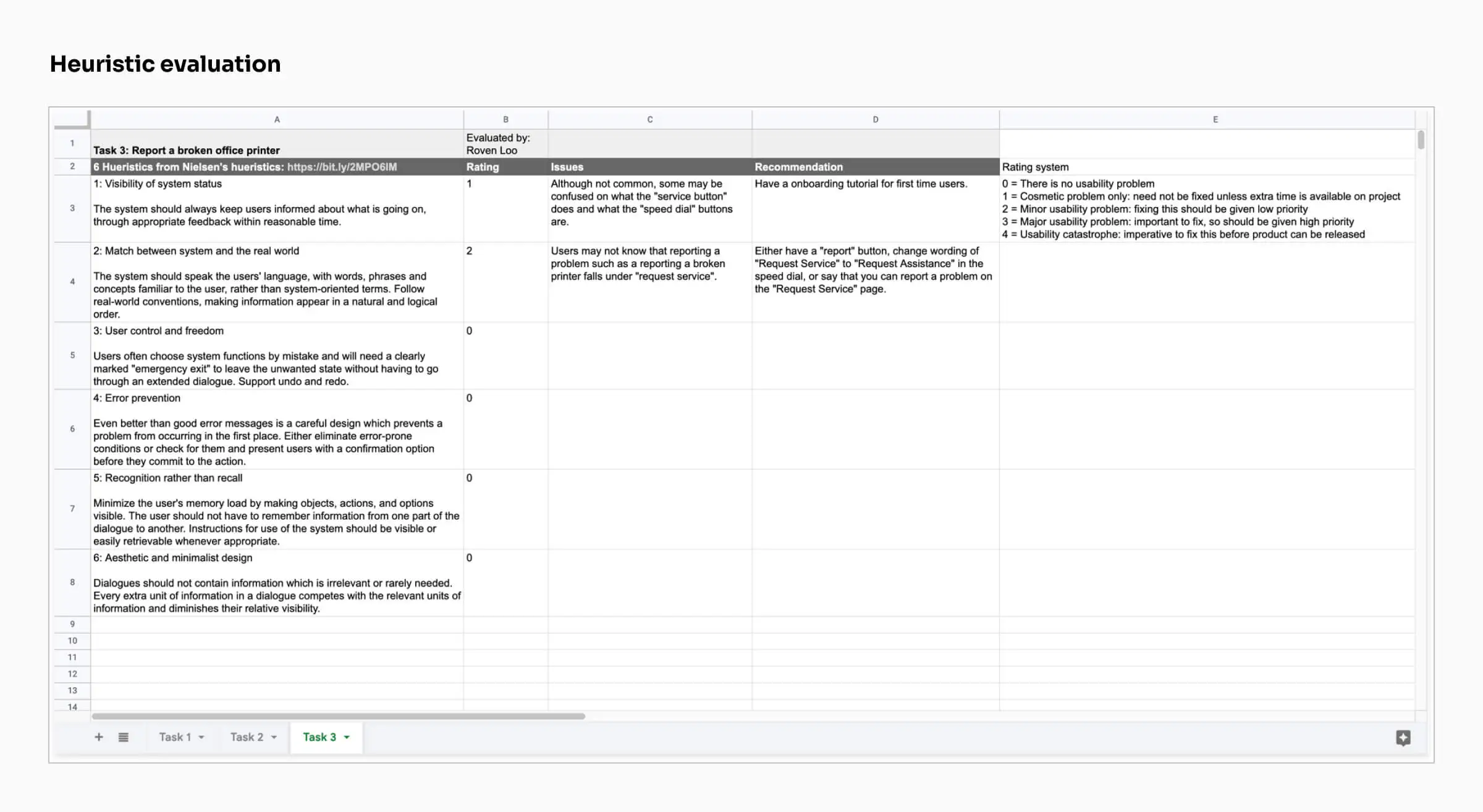 After the first prototype was done, heuristic evaluation was done before user testing. This is a usability inspection method that helps to identify usability problems in the UI and judge its compliance with recognized usabilty principles. I decided to add this step to identify potential usability problems early on to help minimize the iterations after each round of user testing, due to time constraints and resources. The heurisitcs are based on the Nielsen Norman Group's "10 Usability Heuristics for User Interface Design".