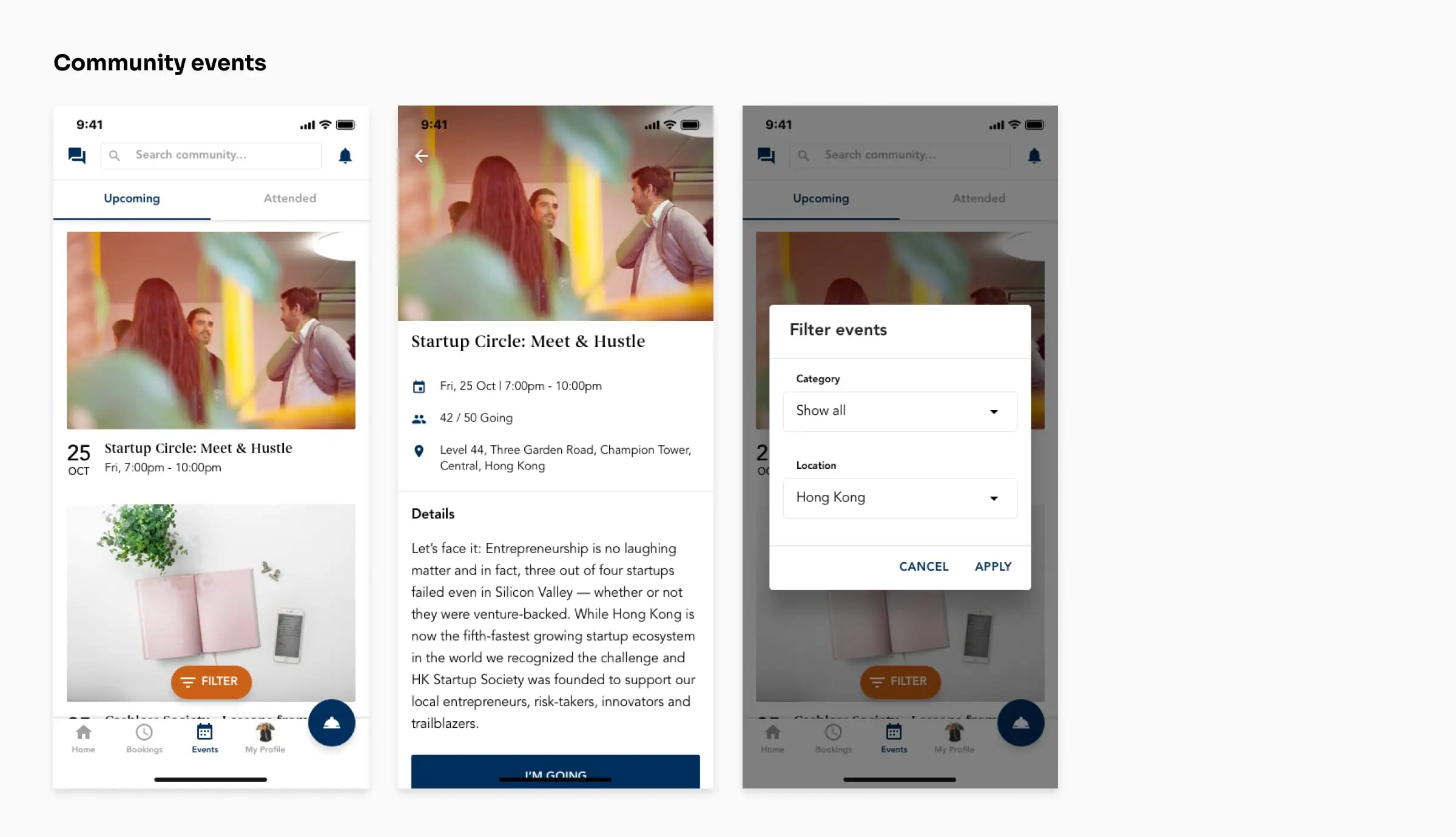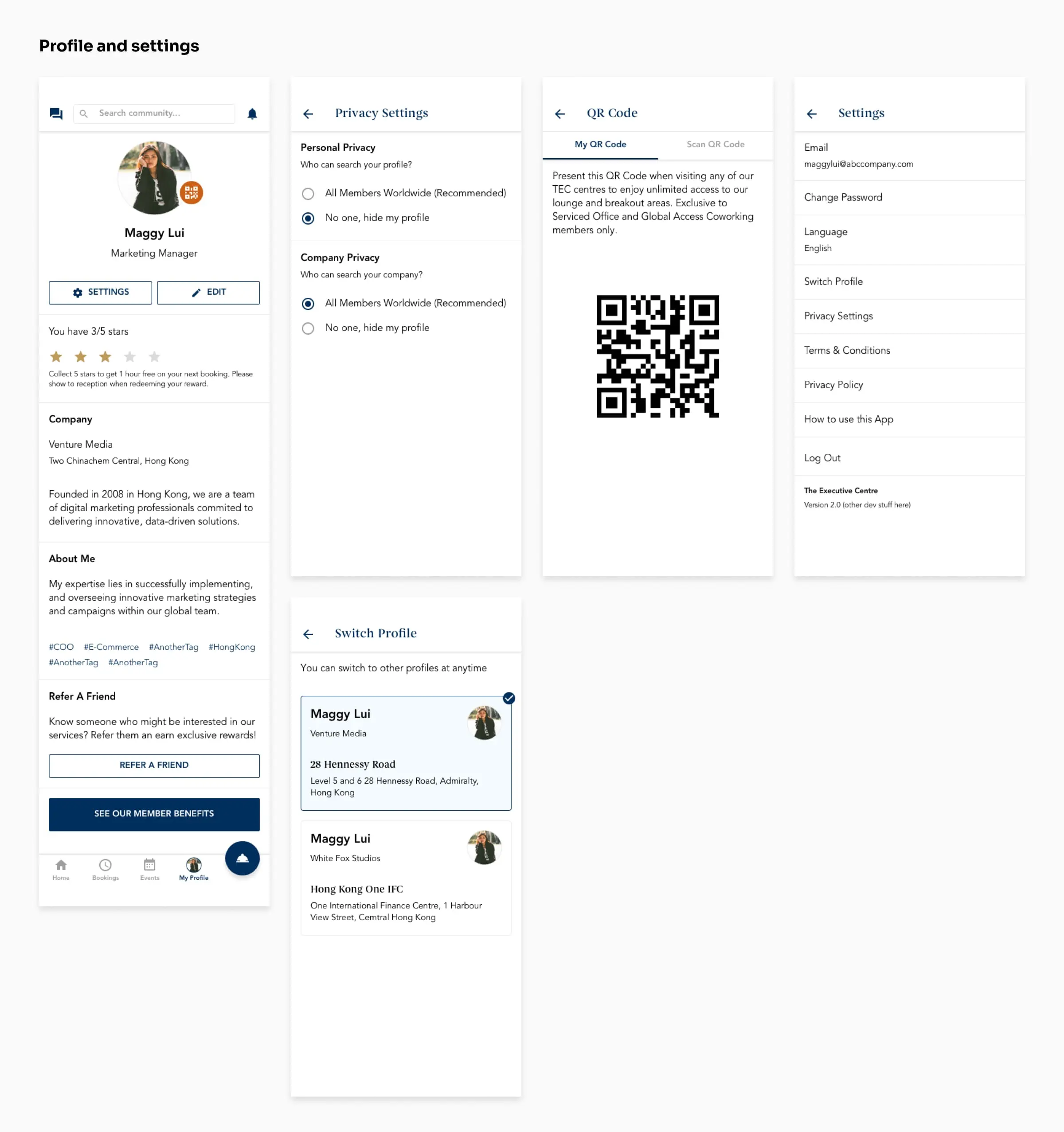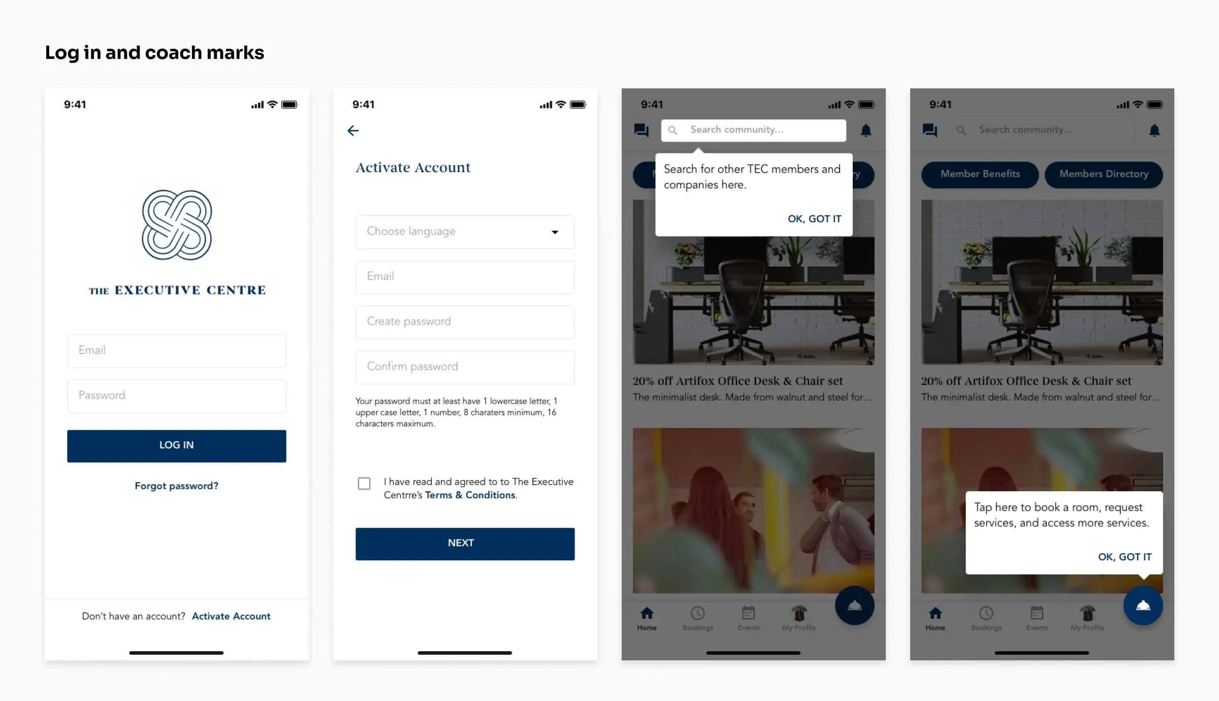 The app's features are; Booking meeting rooms and event spaces, member directory, help desk ticketing system, concierge service, joining events, F&B ordering, member benefits, and more. The floating action button on the bottom navigation has a "speed dial" UI pattern so that users can easily access fundimental TEC services. The "speed dial" UI pattern also makes it modular to add new features to the app.
